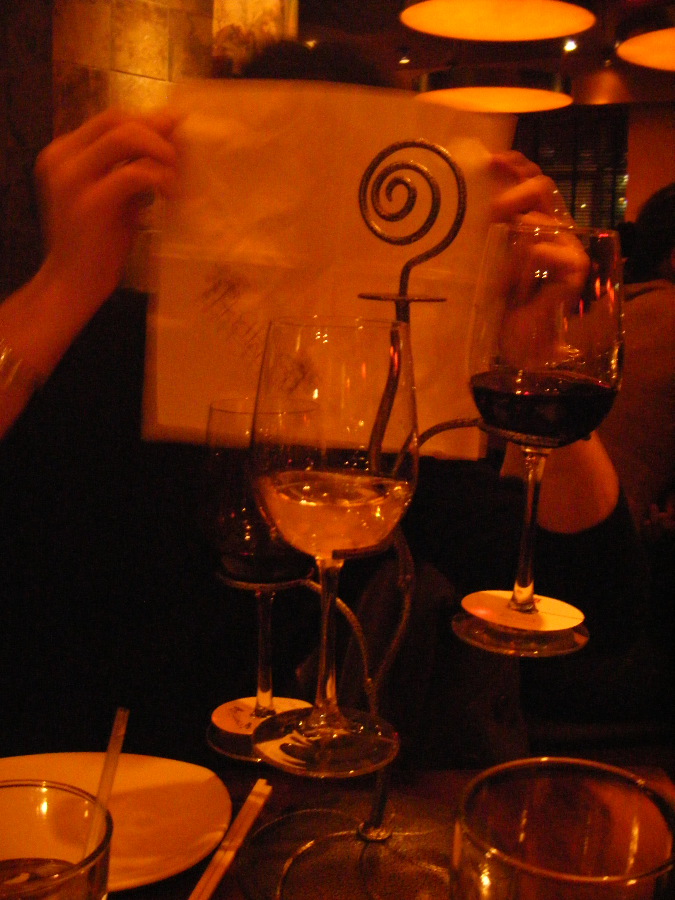 Most restaurants that offer wine flights serve them in smaller glasses which really doesn’t really allow the wine to open and it takes away from the bouquet and aroma factors. The server will also bring the glasses in this fancy wrought iron wine glass “tree” (pictured above) which is very attractive and also efficient as it doesn’t take up too much space on the table.